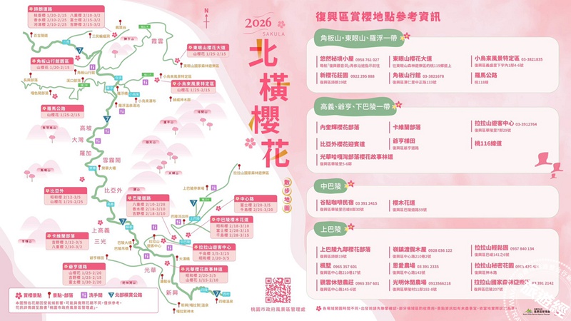 桃園觀旅局陳靜芳局長指出,預計前往桃園市復興區巴陵地區一帶賞花的民眾,市府團隊參考歷年花況資訊,推出「2026北橫櫻花散步地圖」,欲賞花的民眾可至「桃園市政府風景區管理處」或「探索北橫」粉絲專頁下載最新賞櫻地圖,此外,欲知道最新花況資訊者,亦可關注「桃園市政府風景區管理處」臉書粉專查詢最新櫻花花況資訊!