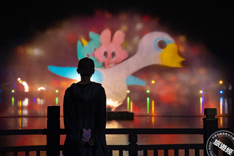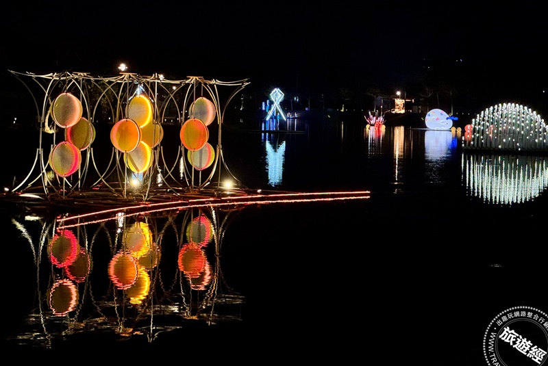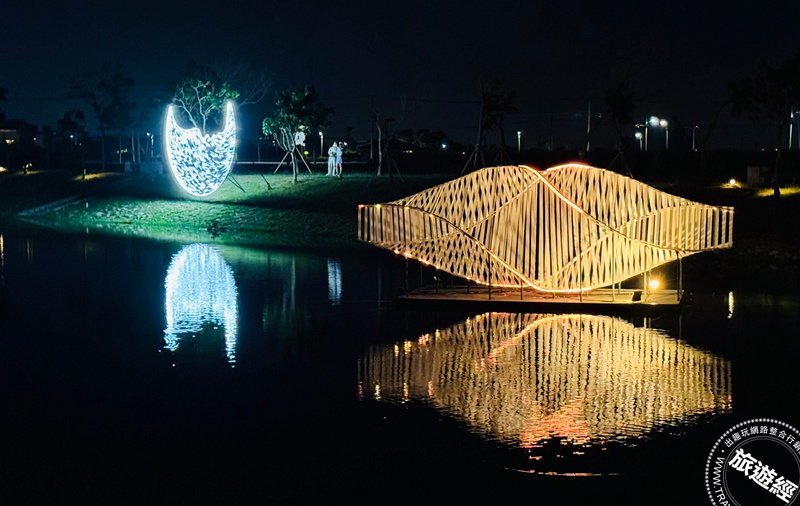新營天鵝湖舉行的「波光節」,圖為黑川互動媒體藝術創作的《共生島:湖畔的波光派對》。(圖片提供/台南市政府)