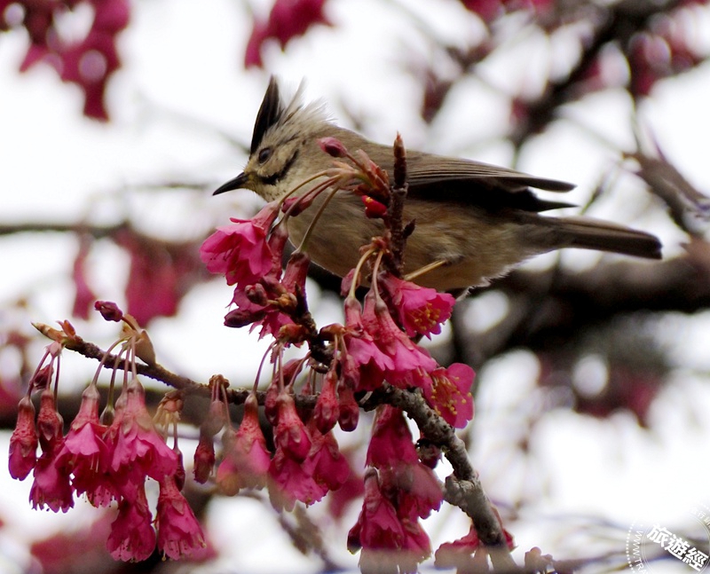 阿里山花季3月登場最新住房體驗 ,圖為山櫻花與冠羽畫眉(攝影:洪書瑱)