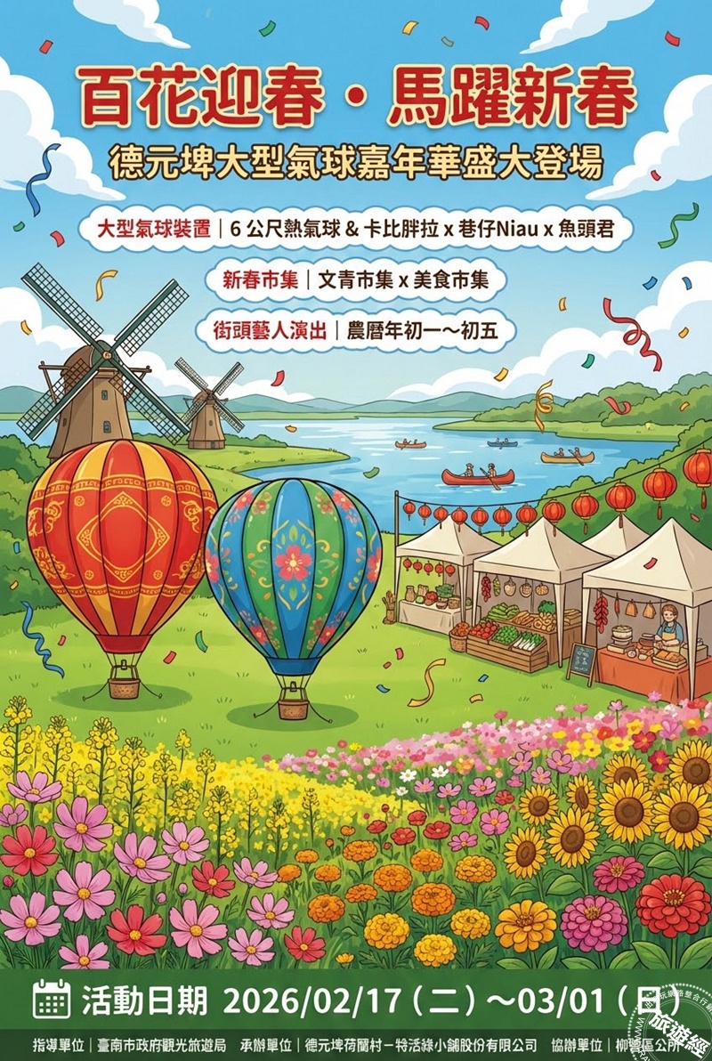 台南「德元埤」擁有遼闊的自然空間與獨具特色的異國風情園區,有一種偽出國之感,是春節連假期間適合全齡族群造訪的熱門旅遊景點,為迎接新春佳節,德元埤荷蘭村於2月17日至3月1日舉辦「百花迎春・馬躍新春 德元埤大型氣球嘉年華」(2月15日至16日休園)。活動以大型氣球藝術裝置為主軸,結合人氣可愛角色、百花花海景緻及主題化露營體驗,打造春節期間兼具視覺亮點、親子互動與療癒氛圍的節慶型園區活動,邀請民眾走春踏青,感受德元埤獨有的新年魅力。