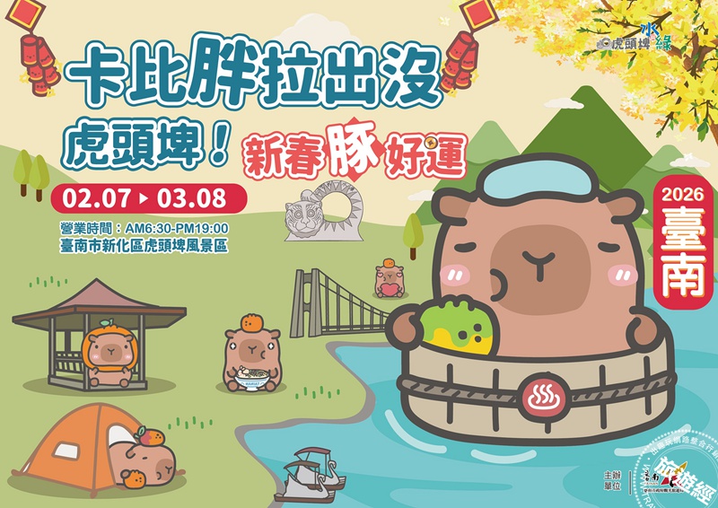 而值得莞爾的是──人氣明星卡比胖拉,不只在德元埤現身,療癒系的卡比胖拉同時還現蹤於虎頭埤,即日起至3月8日推出「2026卡比胖拉出沒虎頭埤!新春『豚』好運」活動,邀請高達12公尺泡著溫泉的超萌水上氣偶「慢活湯柑」再度悠閒現身,陪伴民眾祈福迎新年,成為臺南新春最療癒、最吸睛的打卡亮點。