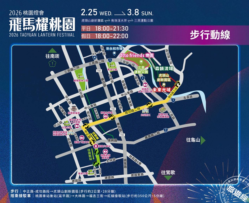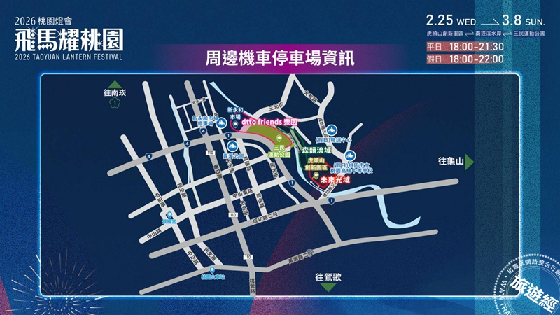 另,機車族可利用青溪公園、桃園高中(假日)及退輔會職訓中心(假日)臨時停車場。此外,也推薦「舊城區散策」,由桃園火車站步行出發,沿途探訪歷史景點與在地美食,以最輕鬆愜意的節奏避開車潮,深度體驗桃園城市魅力。
