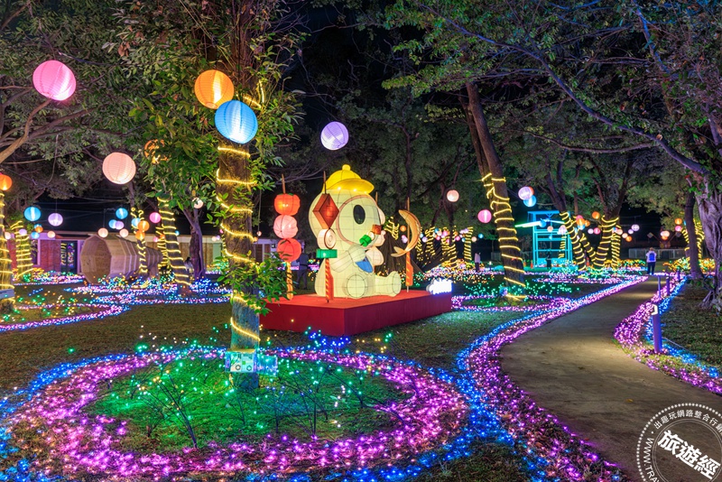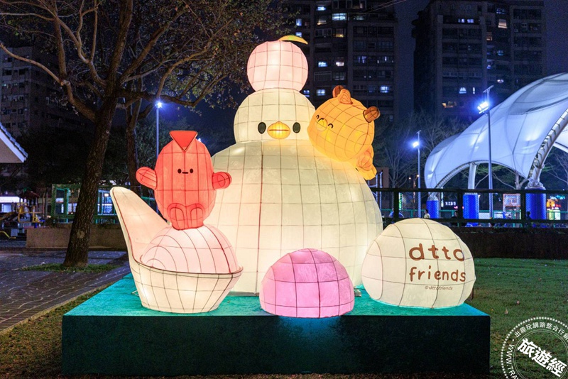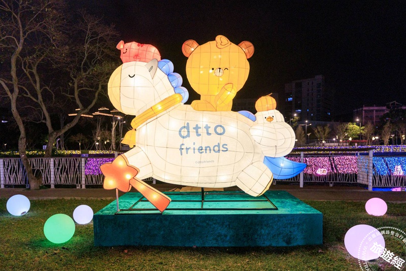 冒險終點來到三民運動公園,由 Dcard 人氣 IP dtto friends 坐鎮!腸太郎、狗狗和好鴨等角色換上馬年限定裝扮,並融入吃元宵、放天燈等傳統元素,是今年最夯的社群打卡熱點。在童趣氛圍中,農業局特別打造的「馬力食足」燈組同樣吸睛,以勤勉的馬兒結合桃園在地農特產意象,傳遞「馬到成功、食在滿足」的豐收喜悅。