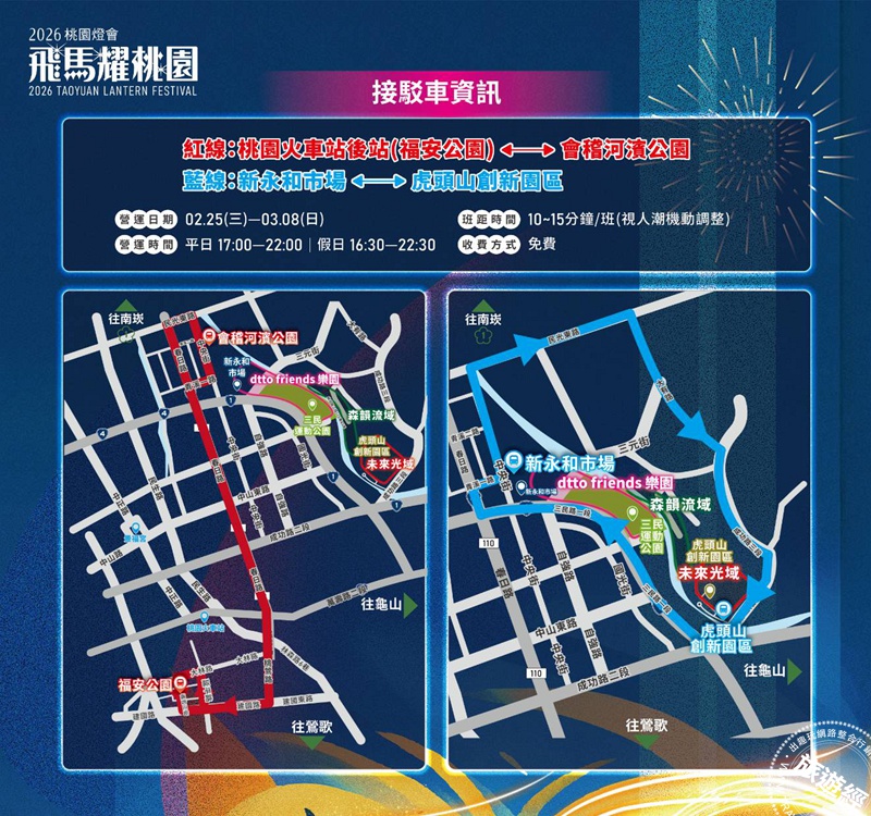 燈會期間提供兩線免費接駁車,平日 17:00、假日 16:30 起營運,約 10 至 15 分鐘一班:紅線(桃園火車站後站 ⇄ 會稽河濱公園)及藍線(新永和市場 ⇄ 虎頭山創新園區)。開車民眾建議停放於新永和市場或桃園火車站周邊停車場轉乘接駁車。