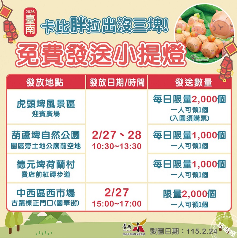 台南元宵節之際不走尋常路線,不以生肖或主燈做為小提燈主角為造型,而是將去年IP展網路票選為依據,將最佳人氣作品「芒果午憩」化身為2026年超萌小提燈主角「卡比胖拉」,其造型曝光,果然獲民眾熱烈迴響,圓潤療癒的水豚造型,搭配悠閒靜謐的埤塘水域意象,象徵臺南自然、放鬆、慢活的旅遊節奏,不少網友在臉書留言大讚「超可愛」、「小朋友一定喜歡」、「很有特色」,求取聲不斷!為回應民眾所求,今年特別規劃多處限量發送場次,民眾在228連假期間走逛臺南,有機會可以獲取喔,「求取」秘訣報你知!