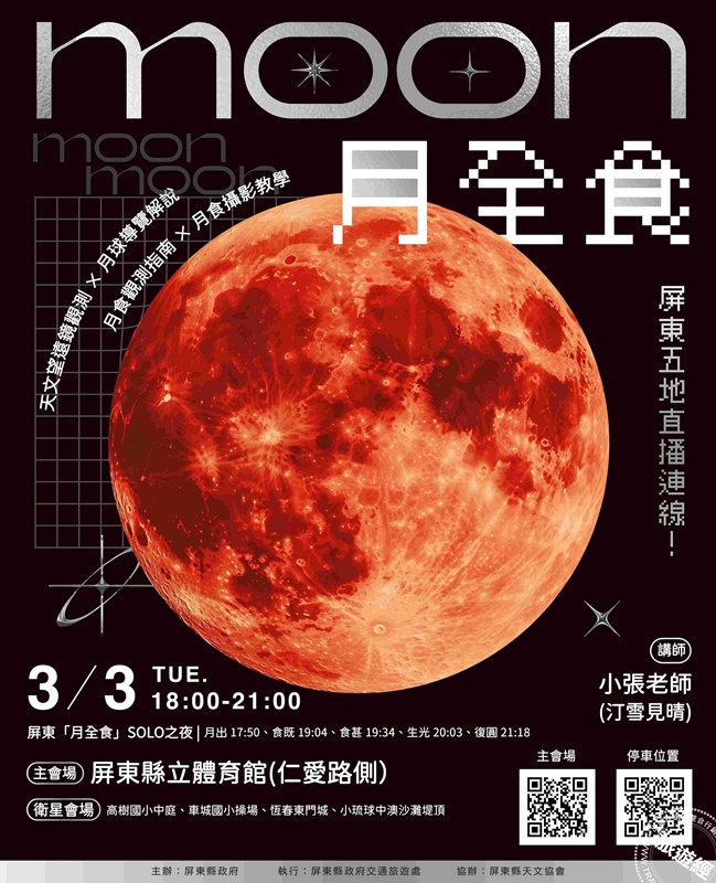 屏東縣立體育館的主會場,活動將於當晚18:00正式展開。現場除了邀請星空大使施世治老師進行專業月全食導覽外,更規劃多樣化互動內容,包含:月球解說與導覽(深入淺出認識月全食成因與月球奧秘)、有獎徵答互動(增加天文知識的趣味性)、天文望遠鏡觀測(現場提供專業設備,近距離觀察暗紅色的月球)、月食攝影教學(指導民眾如何用手機或相機捕捉最美的紅月瞬間)。