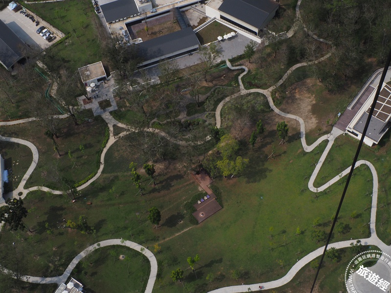 園區順應九九峰礫岩地形規劃,保留逾300株原生喬木,減少約五成混凝土使用量,並導入雨水回收與自然草溝排水系統,匯流至生態池形成微型濕地,營造昆蟲與鳥類棲地。園區內的花園景觀攜手景觀設計團隊「山下植美」導入台灣原生種植物,打造疏落有致的野性花園景觀。步道依坡度延展,保留老樹樹洞轉化為森林故事畫作,讓土地記憶成為環境教育的一部分。