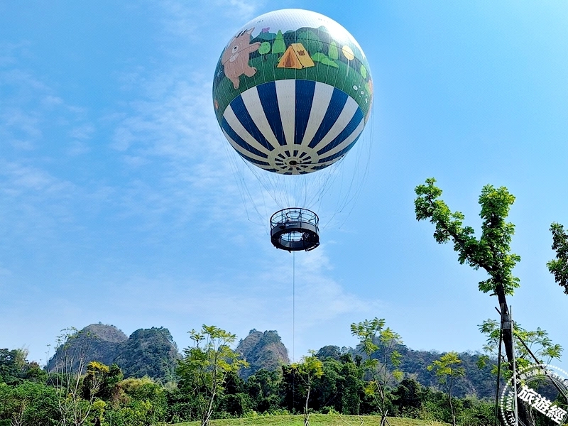 「氦氣球」是園區主打的亮點之一,是全台唯一的繫留式觀光氦氣球,在南投遠方處就能看到,從法國引進,目前提供168公尺(約 56 層樓)的高空觀景體驗(最高能到300公尺),能進行安靜、環保的高空體驗,氦氣球下方吊掛一個類似「甜甜圈」形狀的乘坐艙,採取全程站立式,無座位區,一次最多可容納30 至 35 人(相較於熱氣球僅約 4 人),建議 15 至 20 人最為舒適,總體驗時間約 15 至 20 分鐘,上升與下降各約 3.5 分鐘,在高空滯留看景拍照時間約 8 至 9 分鐘, 近期觀察通常在早上 10:30 之前較有機會飛行,是目前全球現役營運中升空高度最高的氦氣球,在天候允許下,可搭乘能感受升空俯瞰山巒與雲海、夕陽,如:九九峰的礫石惡地地貌以及遠眺南投新景點_鳥嘴潭等,同時還提供晚間搭乘,感受不同的日夜之美。