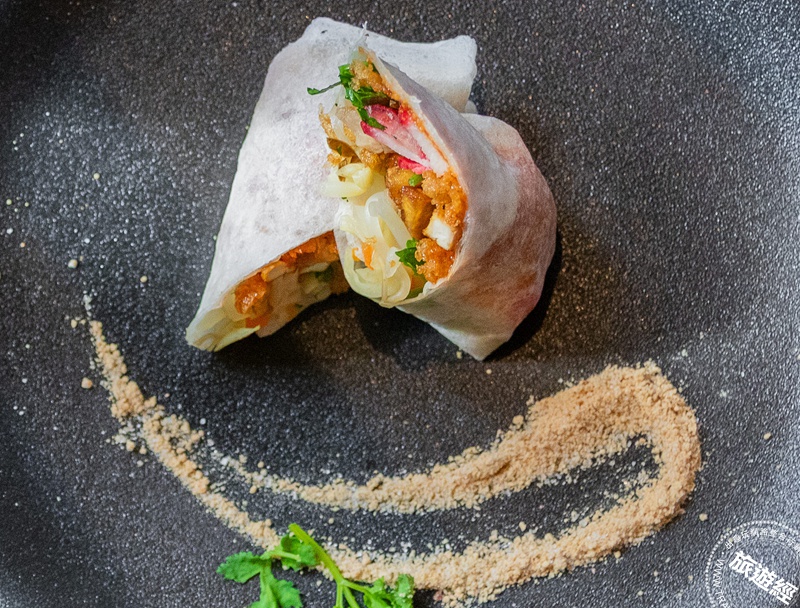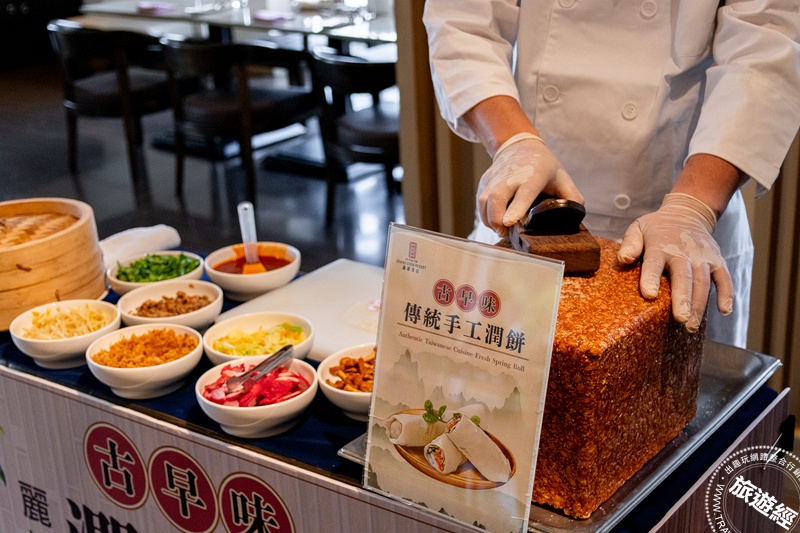 現做潤餅捲含七種豐富經典食材,搭配整塊麥芽花生磚現刨花生粉。(圖北投麗禧溫泉酒店提供)