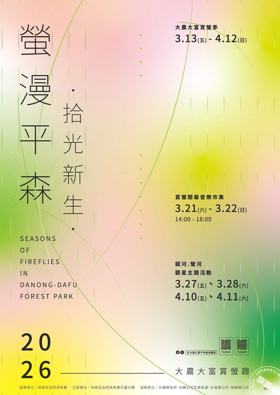被視為夜間精靈──「螢火蟲」,它們不只是浪漫的地上「螢河」,更被人們視為極其靈敏的「環境指標生物」,有螢火蟲所在的地方,就象徵著這個寶地,沒有被人們所污染,在這個講究療癒的年代,不妨趁著火金姑為約會派對「閃亮」登場時,也讓自己進入「淨地」,來場身心靈的FUN鬆之行。台灣的賞螢季節通常從 3 月下旬由南部、花蓮揭開序幕,其中東台灣「大農大富平地森林園區」為最重要的賞螢勝地,現已調查到10種螢火蟲,在遼闊的平地森林中,螢火蟲密度極高,無光害的環境讓人彷彿置身宮崎駿的動畫場景,而一年一度的自然盛事花蓮光復「大農大富」的賞螢季已登場,今(2026)年以「螢漫平森-大農大富賞螢趣」為主題,活動至4月12日止!