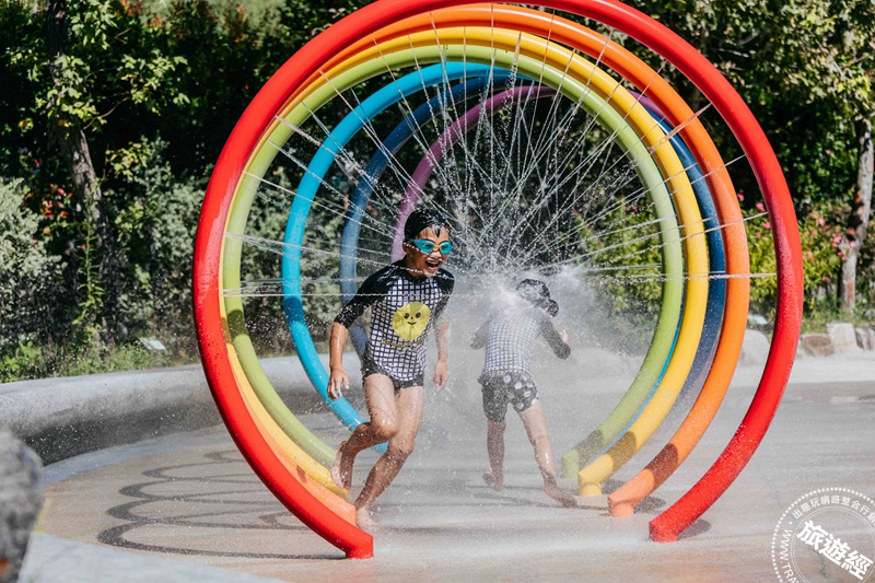 葉谷綠能溫泉園區推出兒童節限定贈禮,4月1日至4月6日期間,每日購票入園前30組遊客可獲得限量「甜香爆米花」乙份,圖為冷泉遊戲區。雲朗觀光提供