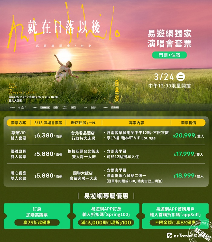 由於官方搶票時間已結束,今天還有搶票機會,易遊網為歌迷們打造3款【孫燕姿《就在日落以後》巡迴演唱會-台北】獨家套票方案,皆含2張5月15日演唱會門票以及飯店住宿一晚。