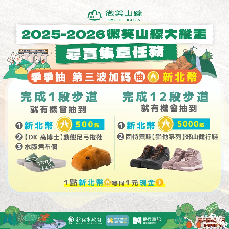 活動期間完成指定步道任務,就有機會抽中新北幣500點至5,000點等多項好禮