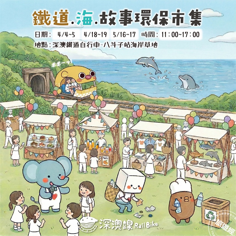 「深澳鐵道自行車」(Rail Bike)自轉型以來,成功將昔日的廢棄軌道活化為充滿生命力的觀光廊帶,自推出後,深受國內外遊客喜愛,今年邁入深耕在地的第7年,為深化綠色旅遊與地方共好的理念,營運廠商規劃於4月與5月於精選週末,在八斗子站旁的海岸草地舉辦「鐵道.海.故事」環保市集。活動舉行日分別為:4月4日、4月5日、4月18日、4月19日、5月16日、5月17日登場,6個場次時間於每日上午11時至下午5時舉行。透過這場融合自然景觀、減塑行動與文創能量的盛會,期盼帶領民眾在全臺最美海岸線旁,與家人、孩童及寵物共同實踐純粹的永續生活。