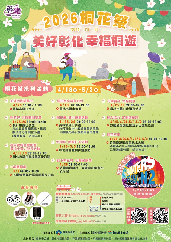 春末夏初之際,白色的桐花相繼綻美,其中中台灣已逾300年「古蹟城市」美名的「彰化」,目前山林已披上潔白的雪白衣裳。彰化為邀您幸福桐遊,一「桐」來賞花,將於明(18)日起至5月3日止,舉辦「2026桐花祭~美好彰化 幸福桐遊」等系列活動。今年不僅串聯彰化五大經典賞桐景點,更首度引入國際級「韓國塗鴉秀」及專業「桐花療」身心體驗等,邀請全國民眾走入山林,感受這場結合生態、文化與感官享受的季節盛宴。