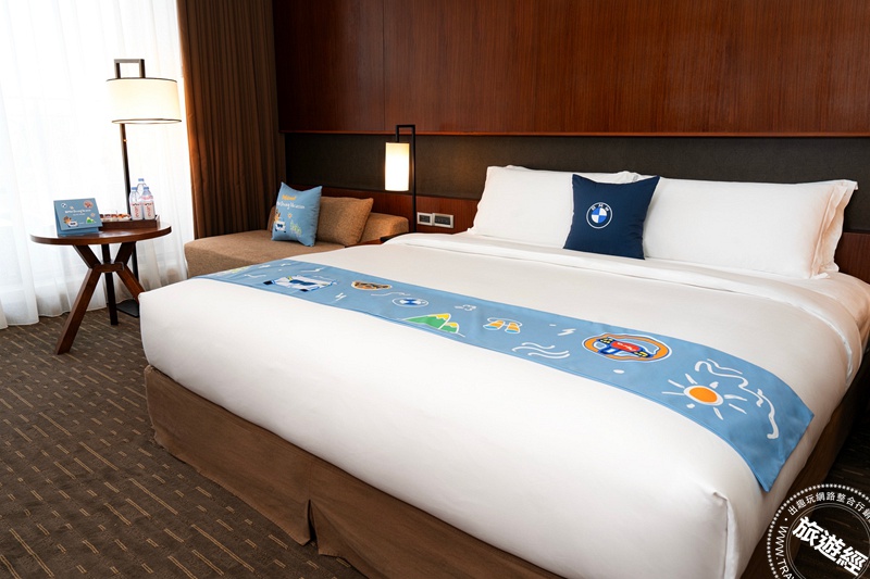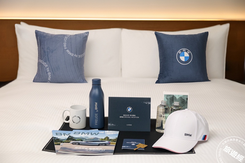 台北晶華酒店 BMW主題房內佈置有沙發抱枕、主題畫作、專屬歡迎信與房卡卡套,搭配BMW模型車、品牌馬克杯等頂級周邊陳設,營造出沉浸式的豪華氛圍