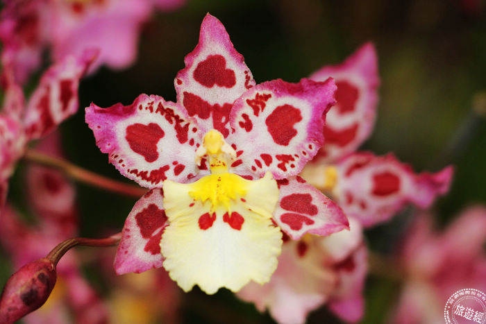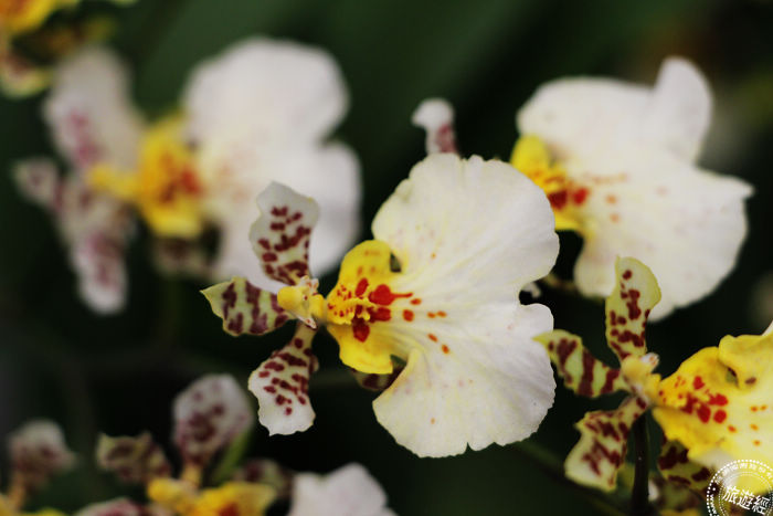 另外,「豹斑寶石」花朵不但比一般文心蘭大上數倍,獨特如豹紋的顏色外觀也別具特色,也因為花色常被誤認為是假花;而「春楓」文心蘭,色彩像似秋天的楓葉一樣,因開花時間卻在春天,因而得名;而花朵顏色火紅的「紅瓢蟲」;花朵具奶油濃香的「奶香腋唇」;花苞階段很像檸檬的「檸檬綠」及我國公部門第一個取得日本品種權的文心蘭切花品種「白雪」等,展場內除了文心蘭外,其中包括此次展覽中,還有少見的春石斛品種「春之頌」,其花徑約6公分,因覆輪紅邊,相當亮麗。另外還搭配色彩鮮艷其他的石斛蘭及蝴蝶蘭等,也一起來襯托喜愛熱鬧每每都一起群聚的文心蘭。