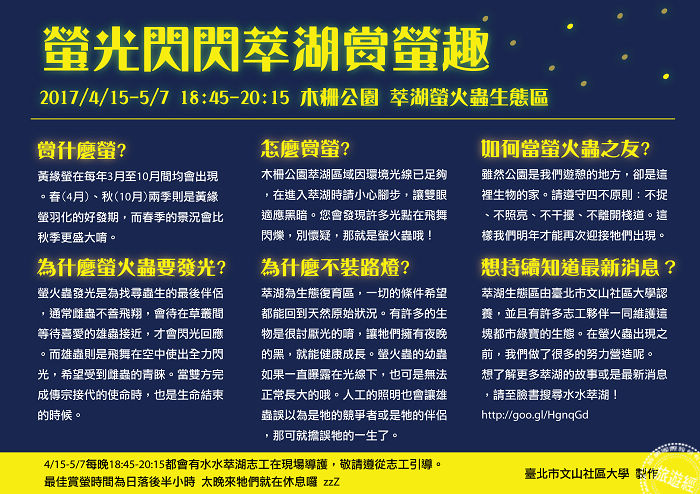 而目前螢火蟲復育三部曲地點,包括3月底已登場的大安森林公園螢火蟲率先開跑外,接著4月中旬木柵萃湖及榮星花園公園陸續均已出現。另外,富陽生態自然公園因地理位置,也有展螢光,想目睹都市賞螢,不妨來計劃一「夏」螢光之旅。