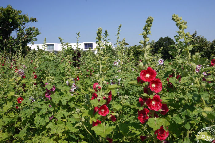 白色的美術館搭配藍天及繽紛蜀葵形成美麗的景緻