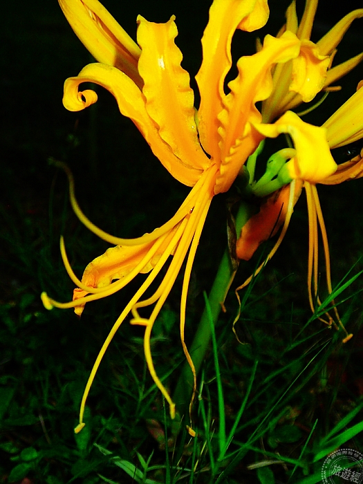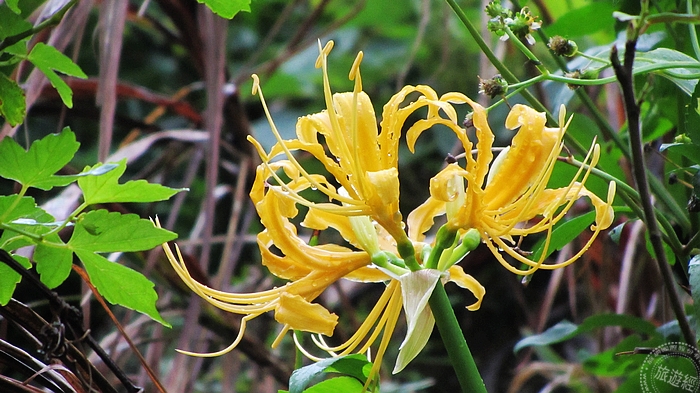 每年9月至11月為金花石蒜的花期,花色呈現金黃色,花瓣向外翻轉,猶如龍爪,因此也有人稱呼它為「龍爪花」。除外型亮眼之外,金花石蒜的生長過程也相當奇特,花謝之後植株葉片才會長出來,到了隔年4、5月間葉片會枯萎脫落,之後進入一段休眠期,到了9月才會抽梗開花,形成了「有花無葉、有葉無花」的特殊景象。