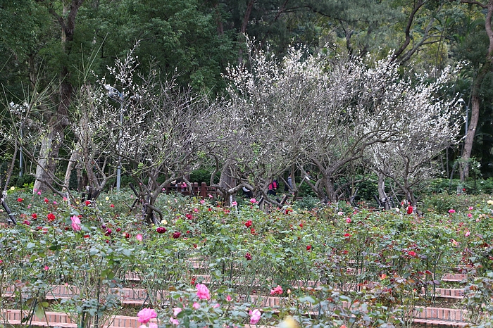 臺北市公園處表示,士林官邸公園內的玫瑰園西側園路上一片成齡梅樹,據說早期為蔣中正總統指示栽培,與其夫人蔣宋美齡獨愛的玫瑰相互呼應,象徵英雄配美人,現正逢梅樹花期綻放,格外應景 ; 另具中式庭園特色的志成公園內亦栽植數棵梅樹,與古色古香的窗格圍籬、園路相映襯,乘坐在梅樹下休憩暢聊,景色怡然自得。