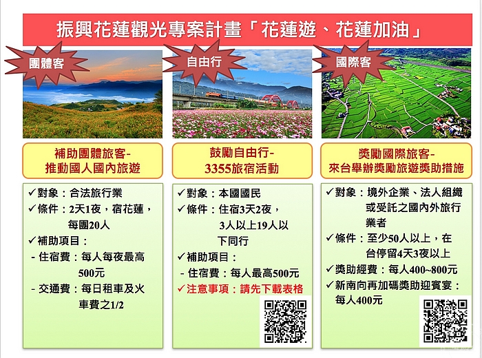 花蓮2月6日地震屆滿一個月,當時雖造成建物傾斜塌陷,但事實上花蓮的景點並未受到影響,但因民眾信心問題而造成花蓮觀光重創。交通部觀光局為協助花蓮重振觀光並鼓勵民眾前往花蓮旅遊,即日起辦理鼓勵國人自由行「3355」旅宿活動,於昨(6)日起於活動期間內,符合3人以上、19人以下同行,在觀光局網站公告之花蓮地區旅宿業達3天2夜以上者,每人最高可享新臺幣500元之住宿補助,經費申請完畢即提前公告停止活動。而在花蓮的飯店業者也藉機各推出住宿優惠,邀請大家一起到花蓮玩樂,民眾可計畫到太魯閣等地玩樂,亦可計劃到大農大富平地森林園區,感受一下每年的三到五月限定款大自然生物所「螢」造的夢幻美景。