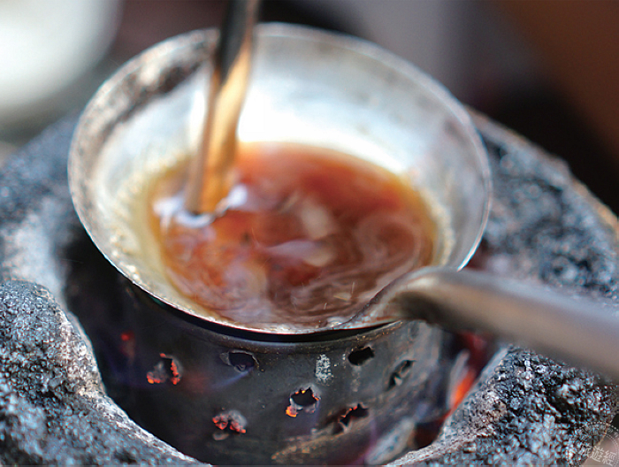 若想親自體驗古早味,手做椪糖算是相當趣味。幾把矮凳擺在路邊,屁股一坐就能對著小火爐煮椪糖。濃稠的糖液隨著高溫沸騰翻滾,配上幾道手勢與小蘇打、攪拌棍,幾分鐘就讓糖膨脹成為肥嘟嘟的椪糖。帶有蜂巢狀的椪糖吃起來類似固體棉花糖,極甜,樂趣大於美味。