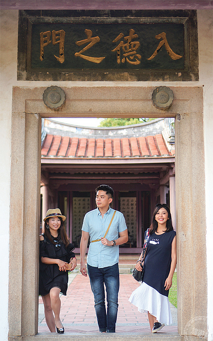 ↑(左起)旅遊部落客傑菲亞娃、 明星旅遊作家ERIC、女神主播/藝 人芳瑜在孔廟入德之門合影。