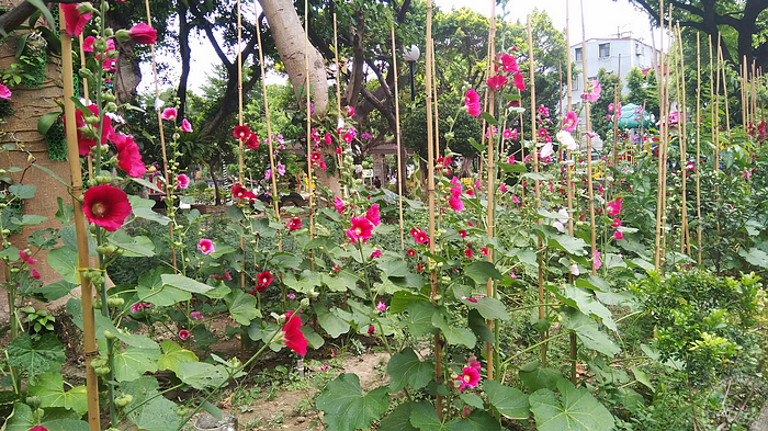 新北市三重區順德里利用蜀葵打造美觀可食的花牆(圖:新北市景觀處提供)