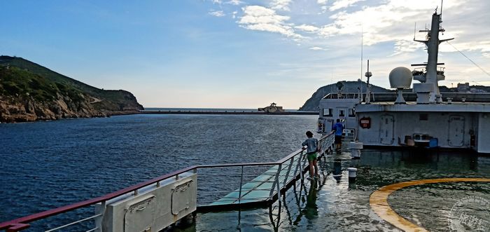 臺馬輪航抵東引 遠眺串接東引島及西引島的中柱海堤 (攝影:廖晨光)