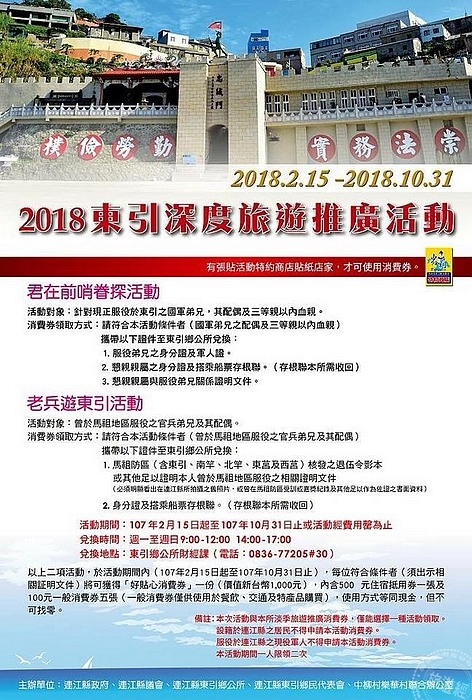 緬懷過去展望未來,為歡迎馬祖退伍老兵、或現仍在東引服役之國軍弟兄與眷屬踏上國境最北島嶼,由連江縣政府、東引鄉公所等共同主辦「2018東引深度旅遊活動」,凡符合條件者即可獲得1000元消費抵用券。據東引鄉公所表示東引深度旅遊推廣活動返島老兵及家眷參與踴躍,預定 10月31日結束或補助經費用完即提前結束。欲參加活動的眷探家屬及老兵把握機會,最後名額至今僅剩餘約70餘名額,有興趣的老兵及家眷可要把握最後名額及機會!活動詳情可至東引鄉公所或官方網站(http://www.dongyin.gov.tw/)查詢!