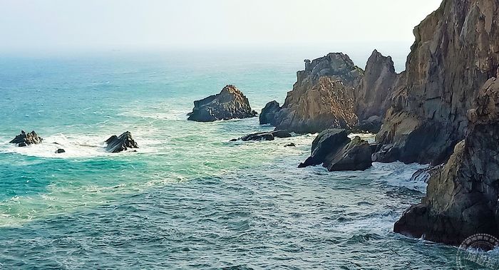 「烈女義坑」俯瞰深約百餘公尺的天然海蝕崖谷底波濤洶 (攝影/廖晨光)