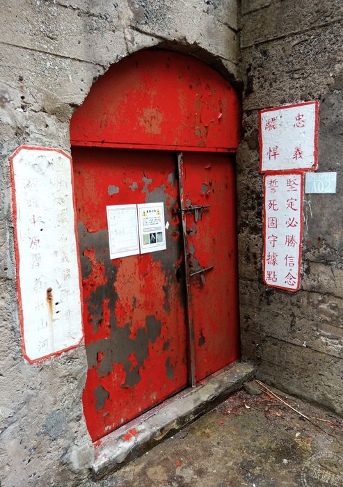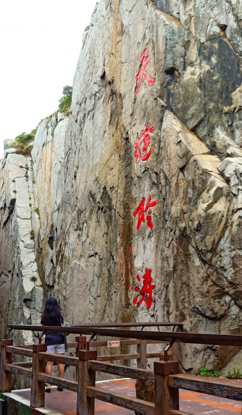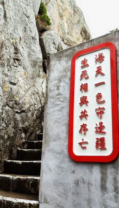 在「一線天」觀景台旁垂直岩壁上端,有時任參謀總長賴名湯上將巡視此據點時所題「天縫聆濤」四大字,絕妙描述「一線天」的動人之處。而沿途已荒廢營區及陣地壕溝二側壁上,亦仍漆寫著「破斧沉舟絕後路、背水一戰能逢生」、「誓死固守據點、堅定必勝信念」等慷慨激昂標語,在陣陣海潮衝擊響聲迴盪下,揭櫫當年駐軍弟兄們誓死捍衛據點的決心!亦不經令人感嘆在二岸對峙年代的無奈。