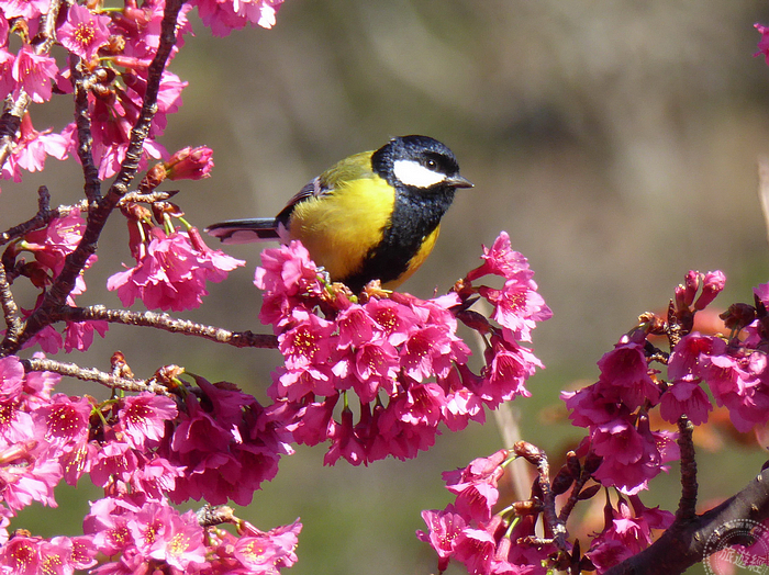 青背山雀不讓冠羽畫眉專美於前,亦在綻放的櫻花中現身