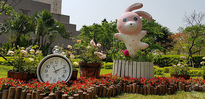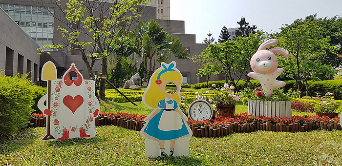 台北市公園處除了在花博公園新生園區規劃了春季玫瑰展至4/8止,士林官邸玫瑰展的官邸玫瑰園,則從4/12起至4/28止接力展出!台北市公園處南港公園管理所主任張秀珠表示,為配合及推廣春季的玫瑰展活動,在台北市府北門設置了─愛麗絲夢遊玫瑰園主題宣傳點,有超級卡哇伊的兔子,在玫瑰花叢中起舞的模樣,還有撲克牌衛兵及愛麗絲可供拍照,其中兔子手中的懷錶,是以廢棄盆器改裝而成,相當具特色。