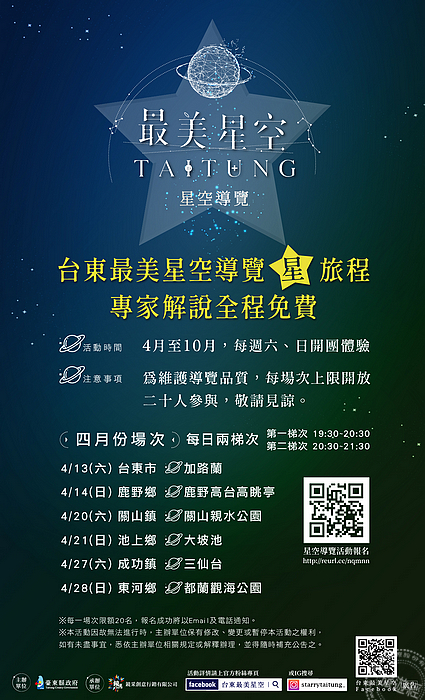 相關導覽活動全程免費,但為維護導覽品質,每梯次僅開放20人報名,名額有限,額滿為止。而台東除了「台東最美星空導覽活動」外,今年將持續推廣台東最美星空系列活動,相關訊息請至官方Facebook【台東最美星空】及Instagram【StarryTaitung_】查詢。