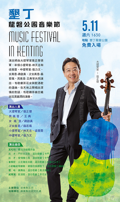 雖然(2019)年春吶不在墾丁,但墾丁將有不同的音樂演出!5月11日下午將舉行第一屆墾丁龍磐音樂節,演出陣容在大提琴家張正傑的帶領下,更集結樂壇一流好手,包括女高音蔣啟真,次女高音翁若珮,男高音王典,男中低音丁一憲,及小提琴家林天吉、梁茜雯,中提琴家徐曉虹等人,而且音樂表演舞台更是別開生面,以湛藍海空為背板,以芳香的大草原為舞臺,欲將龍磐公園化身為歌劇院,讓觀眾親身感受大地與音樂的呼應。
