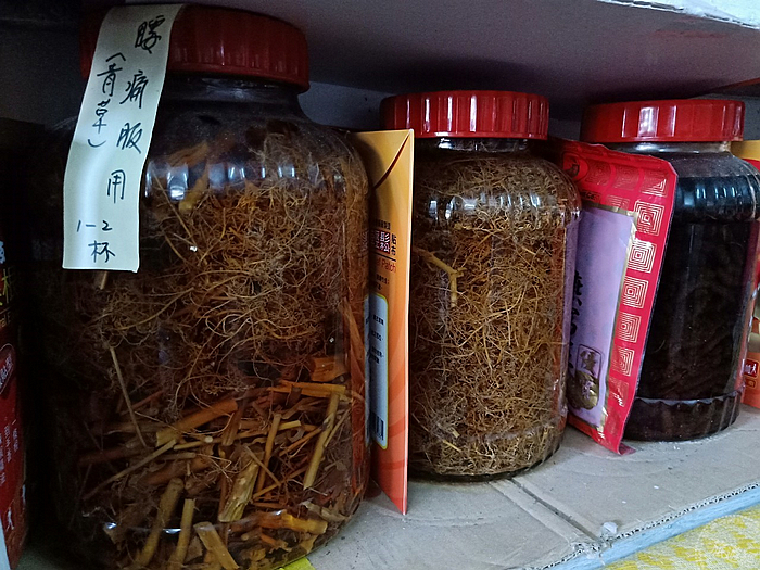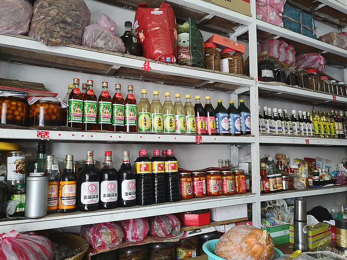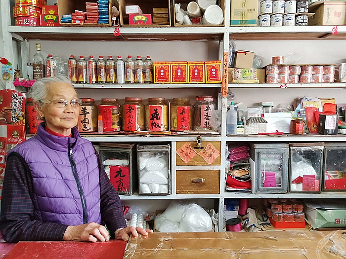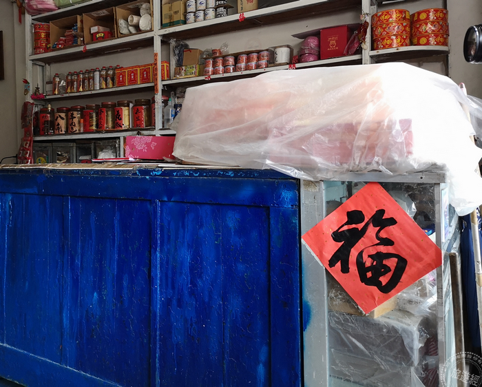 再走幾步,有間看似陳舊的雜貨店,這個場景從戰地政務開始就沒有變過,大概已維持40-50年之久,一眼望去有一個藍色的櫃台,千萬可別小看它,在民國68年前,當年這個櫃台可是能早晚變身,早上是櫃台、晚上翻倒後就變身為床舖,供主人家所聘用的長工做睡覺之用。而這家店的女主人名喚「袁依蘭」,這位婆婆也算大有來歷,婆婆除了是反共救國軍康樂隊的一員外,當年也是接生婆,而婆婆的父親「袁書記」也是醫生,這位醫生除了是位把脈的醫生,也和神明一起配合,為過往窮苦的人家治病,阿公行善助人,而成為神明,而且金身就在北竿的廟宇之中!也由於店裡頭多年未變,還能看到馬祖的老味道魚露、擺了快30年的巧克力煉乳,以及許許多多草藥罐等當年的「歷史」!