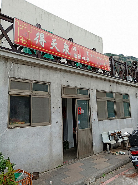 另外,在街上還有僅剩的一間澡堂,當年這間澡堂可說是紅極一時,是北竿軍人所愛,想洗個舒舒服服的熱水澡,就得到68年才建構2排澡堂的「得天泉」來,當時的阿兵哥因為常要挖坑道搬石頭,以致於休息時,手早已癱軟,不用挑水還能泡上一池熱呼呼的熱水澡,可說是撫慰疲憊身心靈的方法!在這裡洗澡算次,也有冷水和熱水之分,從最早之前熱水15元,冷水10元,慢慢變成30、15元,到現在一次50元!只是如今的「得天泉」僅剩少數幾間澡堂可供使用也慢慢在轉型。您若走進「得天泉」,還能看見花磁磚,與有1、2、3等編號的澡間浴室,而且一入門,不妨抬頭望一下,天花板還留有被炮彈直接擊中,又被水泥補起來的大洞痕跡!