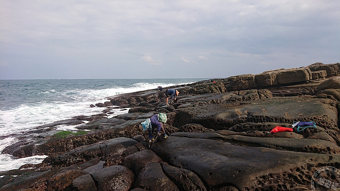 東北角海岸邊一群頭戴斗笠、身著厚衣、腳穿釘鞋,正徒手拔取生長在潮間礁岩上的紫菜