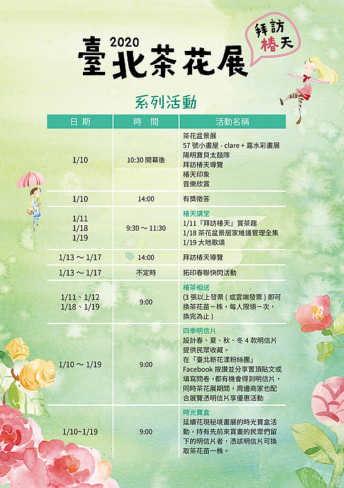 一年一度「臺北茶花展」即將登場,今(2020)年將邁入第17個年頭,全臺歷史最悠久的茶花展!2020年臺北首波花卉盛會──「臺北茶花展-拜訪椿天」將於本週五(10日)起在陽明山上的花卉試驗中心展開,為期十天的茶花展,將展出北臺灣知名茶花達人提供的珍藏茶花盆景,今年度特別呈現較少見的黑色茶花品種,來展現一般花卉較難得姿「色」,加上花卉中心園區內園區超過300種、5000餘株茶花陸續綻放,再搭配展場清透、溫暖色調的插畫,彷佛春暖花開,充滿生機的春天已到來!10日開幕當天,除了可以欣賞茶花外,上午可以欣賞音樂表演、椿天印象-絹印活動,下午還有有獎徵答活動供民眾參與。