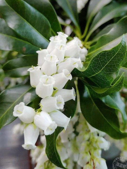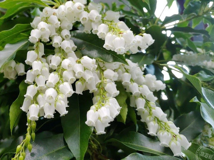《馬醉木》學名為Pieris japonica,英名為:Pieris、Japanese Andromeda,別名梫木。杜鵑花科馬醉木屬常綠灌木或小喬木,原產日本、臺灣及中國華東各省。革質橢圓披針形葉互生,常密生於枝端。總狀花序或圓錐花序頂生或腋生,白或淺粉紅壺形花下垂,蒴果扁球形。開花期春季。馬醉木葉片浸出液自古就當作農藥使用,可防治蚜蟲、紅蜘蛛等小型害蟲。