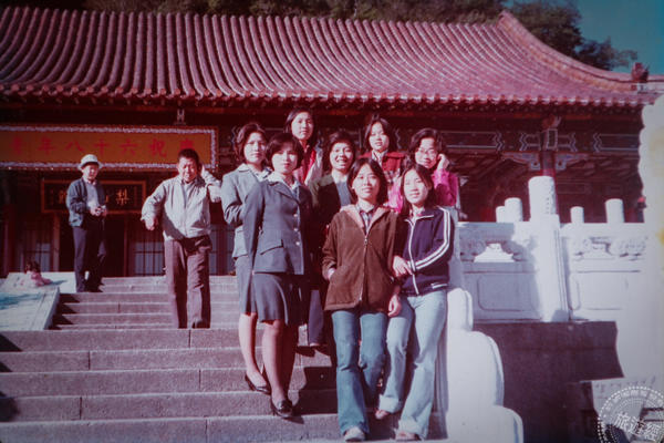 林芸如(中排左)過去於梨山賓館前與遊客合影