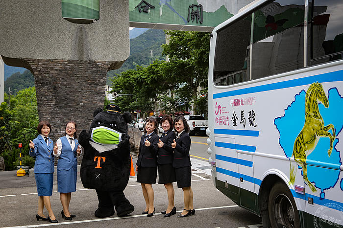 參山處長柯建興表示,為了慶祝60周年慶,特別與公路總局、臺中市政府、豐原客運合作重新塗裝865公車,重現曾風光行駛在中橫公路上的金馬號,讓民眾可以搭乘865金馬號從谷關到梨山,欣賞中橫沿線之美。尤其還特別邀請曠蘭美、卓京紅、張麗美、林芸如、王慧蒼等5位金馬號車掌小姐,穿著當年制服,在交通部觀光局代言人喔熊組長的迎接下,至谷關中橫牌樓前與復刻版金馬號合照,分享當年擔任金馬號車掌小姐時風光回憶,希望藉由復刻865金馬號喚起民眾對中橫的美好回憶,也為中橫觀光下個一甲子開啟新的篇章。