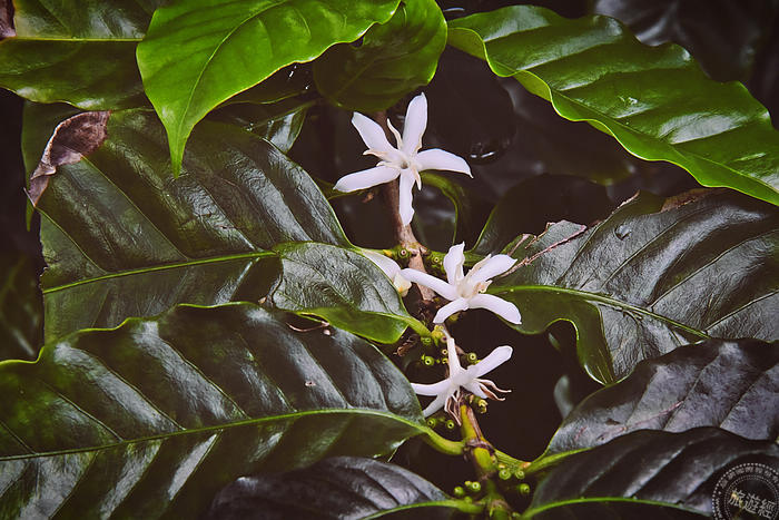 花時緊生於咖啡樹枝呈簇狀,白色的花瓣及清淡的茉莉花香,顯得高貴優雅