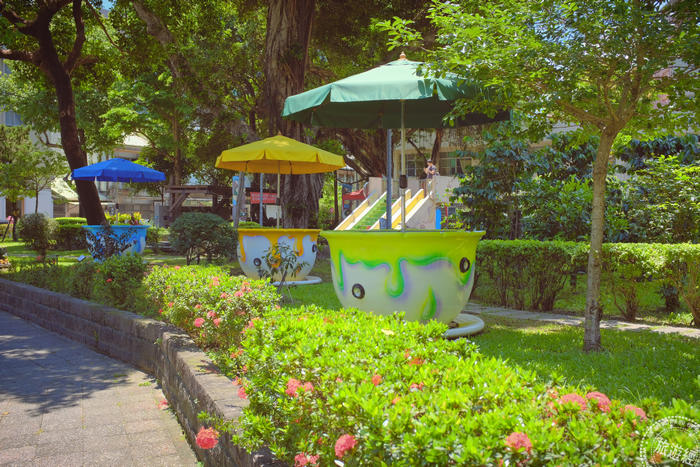 中山區的復華公園是都會區難得一見的咖啡公園,公園內從專屬咖啡杯座椅的可愛陽傘,到磨石滑梯的彩繪均充滿著咖啡意象