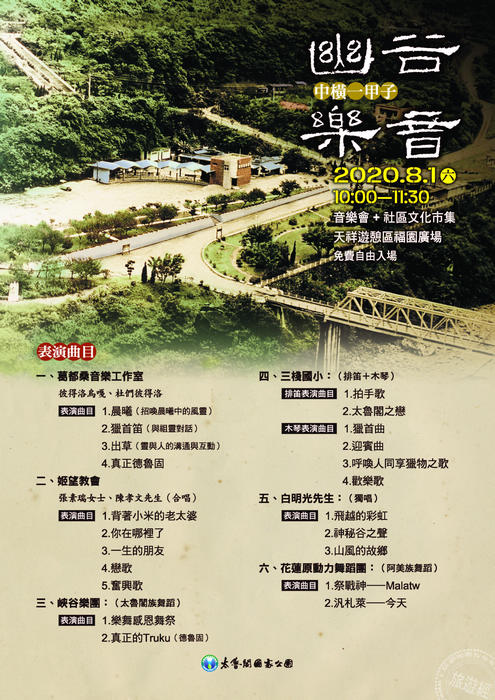中橫公路通車60週年,也就是說中橫啟開以來,已經一甲子的歲月,中橫這條路上或是天祥這個點,對許多人來說是份珍藏的記憶,尤其對四五年級曾參與中橫健行的人來說更是難以忘懷的回憶!而太魯閣國家公園管理處將於8月1日在天祥舉辦「中橫一甲子--幽谷樂音」音樂會,邀請多個在地原住民族樂舞團體與個人演出,除了邀請民眾享「樂」,活動當天還結合與天祥有約活動,由解說員帶領遊客探訪天祥地區的自然與人文,也有社區文化市集,展售在地有機無毒的農特產品及太魯閣族傳統工藝,有計劃前往天祥的民眾,不妨再納入這趟兼具知性與感性的天祥之旅。
