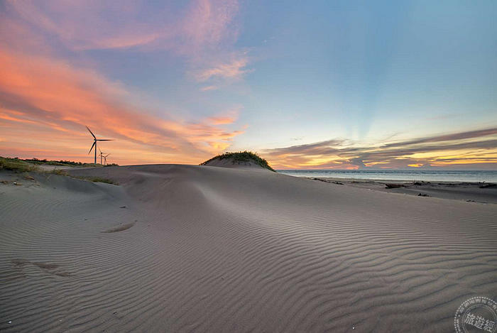 第二夕陽熱點,香山沙丘又被稱為「沙漠秘境」,無邊無際的沙丘,還有蔓荊、馬鞍藤等植物,有網友笑稱,到這裡彷彿到國外,有種荒漠感,若黃昏時刻抵達,夕陽搭配彩霞宛如濾鏡,讓沙丘更有異國感。