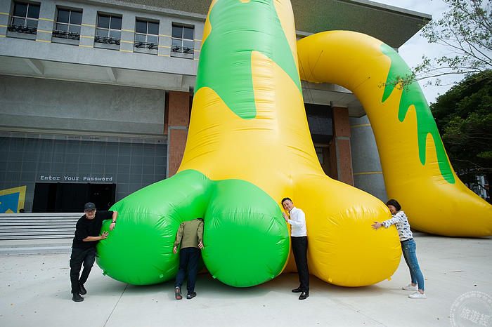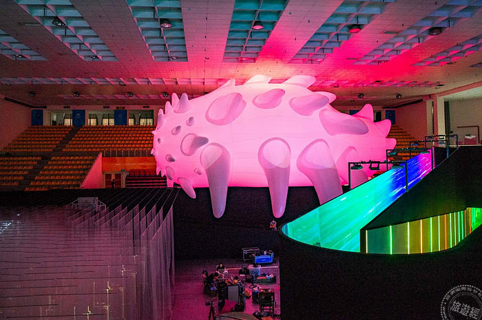 2020台灣設計展區「城市終端機」現場,展示充氣裝置懸浮半空的「新竹獸心臟」(圖:新竹市政府提供)