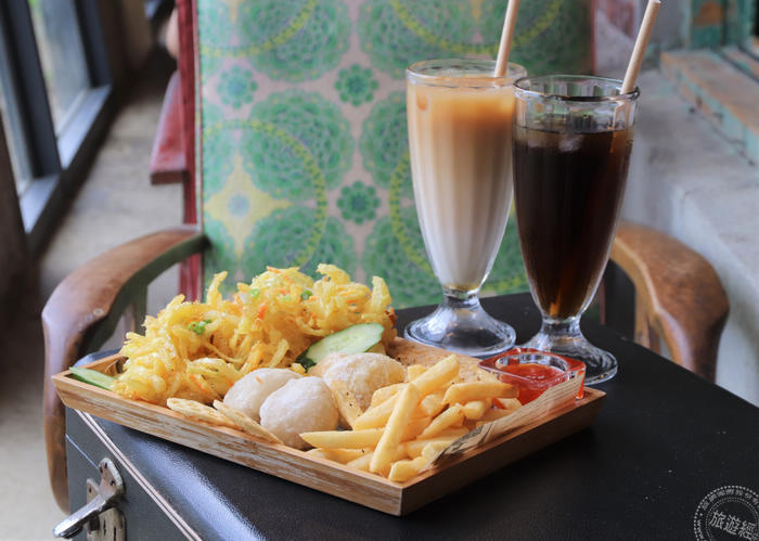 舊事生活的拼盤套餐舊事一直吃,可以同時品嘗客家三角仔、炸蔬菜、雞柳和薯條,再搭配降火茶或奶茶。(攝影:閻家文)